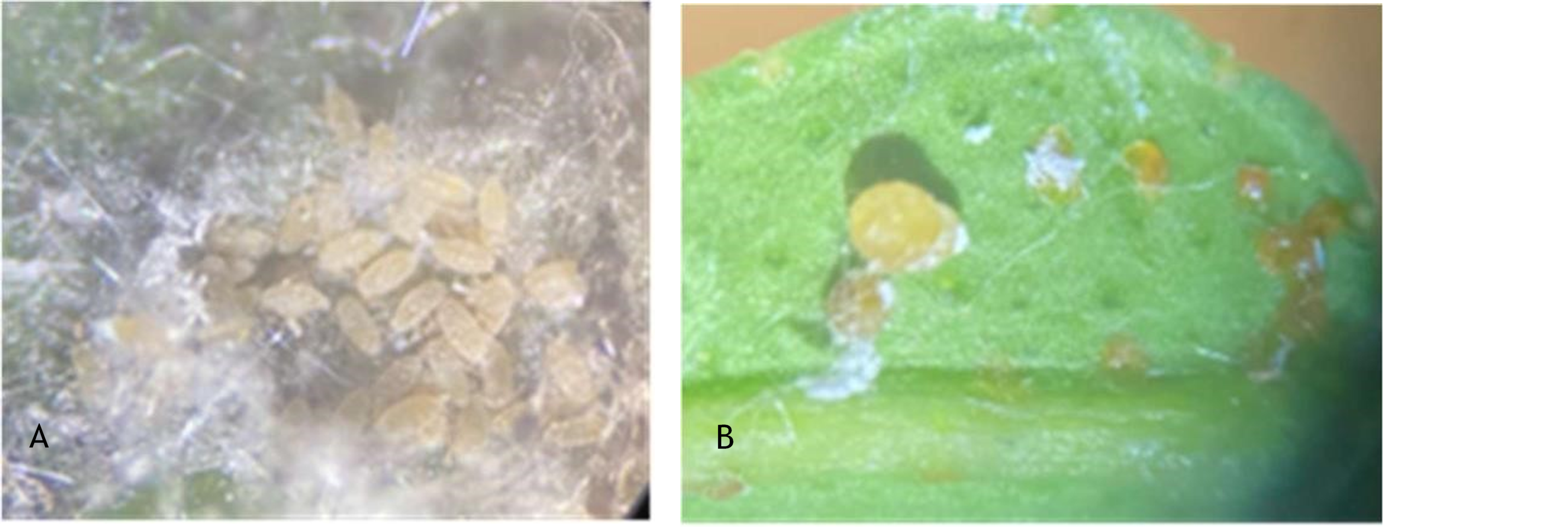 Once the treatments were applied, mortality results were taken at 5, 10, and 15 days. Planococcus citri was counted manually; one leaf was selected from each plant at random for sampling and then observed under a stereomicroscope. The entire surface of the leaf was examined, including the front, back, and edge. The scale insects were divided into two groups, live and dead. The morphological criteria for classification were that live scale insects must be mobile with a soft body, while dead scale insects must be immobile with a rigid body.