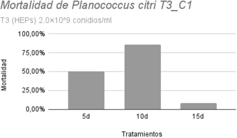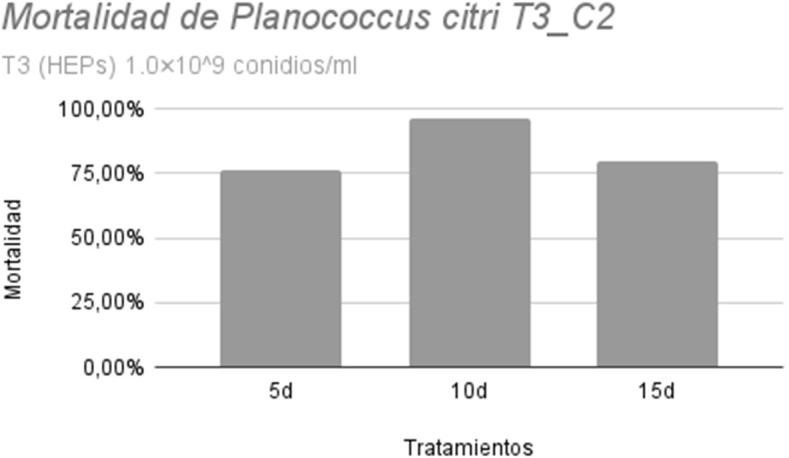 HEP treatments on mealybugs under controlled laboratory conditions tend to show greater effectiveness than those analyzed in the field, due to the controlled conditions. Knowing this, the following is stated: the high mortality rate demonstrated by some of the treatments in our research is inferred to be caused by their correct application, limited exposure to their natural predators, and different external conditions, thus ensuring that the treatments acted on Planococcus citri. It should also be considered that all treatments were conducted under controlled temperature conditions (24 °C), which is a factor to consider since fungi do not develop adequately at unfavorable temperatures.(20)