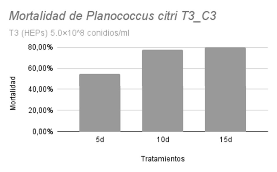 Due to their mechanisms of action, HEPs are emerging as a sustainable alternative for insect control, offering an advantage over chemical insecticides, as these arthropods have shown increasing resistance to them.(2,11,12) The objective of this study was to determine the effectiveness of a consortium of HEPs on mealybugs (Planococcus citri) located at the Salesian Polytechnic University's "María Auxiliadora" campus.