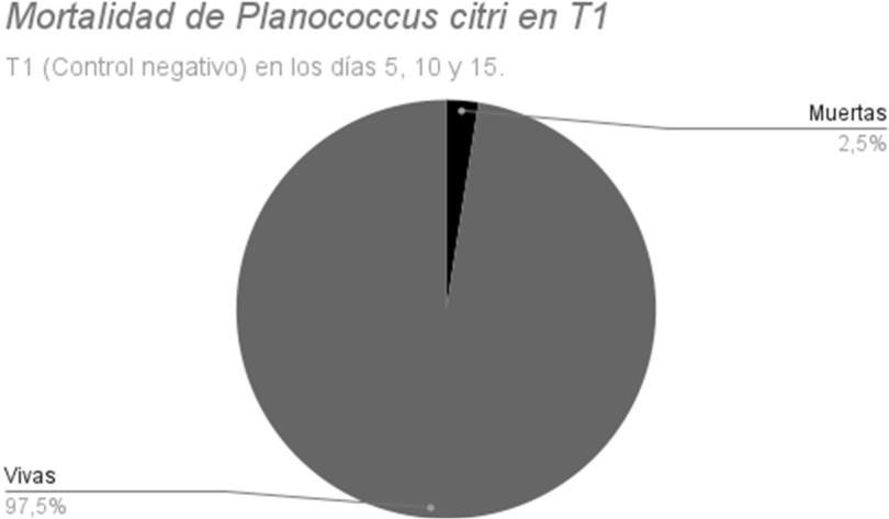 The mortality of the observed cochineal insects in the control group (T1), as well as in the experimental group consisting of HEPs (T3), was quantified in three individual samples taken 5, 10, and 15 days after the application of treatment 3. For each sample, one leaf was collected from each infected plant. The following graphs show the mortality rates of the control group and the experimental group with the data collected.