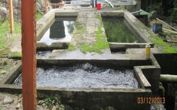 Catchment: The catchment is provided with a structure that goes from side to side of the creek, it has a grid of 0,70 m long, and 0,50 m wide provided with rods with a diameter of 1,59 cm separated every 5 cm built in 1960 for a flow of 35 l/s.(5) The Aduction is carried out by means of a 10-inch diameter PVC pipe a length of 76 meters from the catchment to a break chamber from which two 6-inch pipes in PVC and HF (cast iron) with a length of 36 m to the desander The pipeline was damaged in some sections, it is uncovered along its route.(4) |