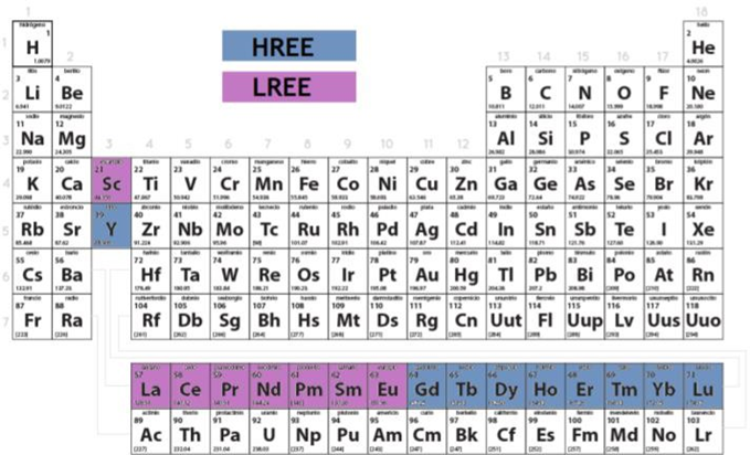 Rare earth elements (REE) are a group of special metals composed of seventeen elements, fifteen of them located in the lanthanide group that contain unique and diverse chemical, magnetic and luminescent properties that make them significantly important in several high-tech industries due to their diverse uses in high-strength permanent magnets, lasers, automotive catalytic converters, fiber optics/superconductors and electronic devices.(1,2) This group of elements is divided into two classes, LREE and HREE, where the former is composed of cerium (Ce), lanthanum (La), neodymium (Nd), praseodymium (Pr), samarium (Sm), europium (Eu), promethium (Pm) and the second includes gadolinium (Gd), terbium (Tb), dysprosium (Dy), thulium (Tm), ytterbium (Yb), lutetium (Lu), holmium (Ho) and erbium (Er).(3)