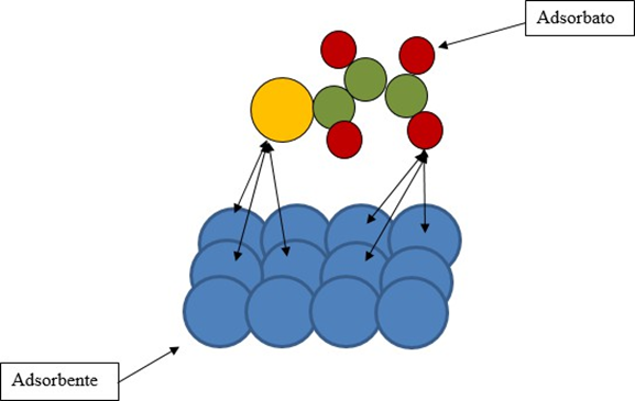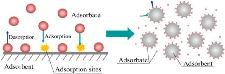 Adsorption has received remarkable attention and acceptance due to its low cost, being a simple and environmentally friendly process. IUPAC defines adsorption as “the increase in concentration of a substance at the interface of a condensed layer and a liquid or gaseous one due to the operation of surface forces “. The solute molecules (adsorbate) are characterized as a substance in solid, liquid or gas phase, which will be adsorbed, and the substance on which the adsorbate is adsorbed is named as adsorbent.(15) The adsorption mechanism is described graphically in figure 2.