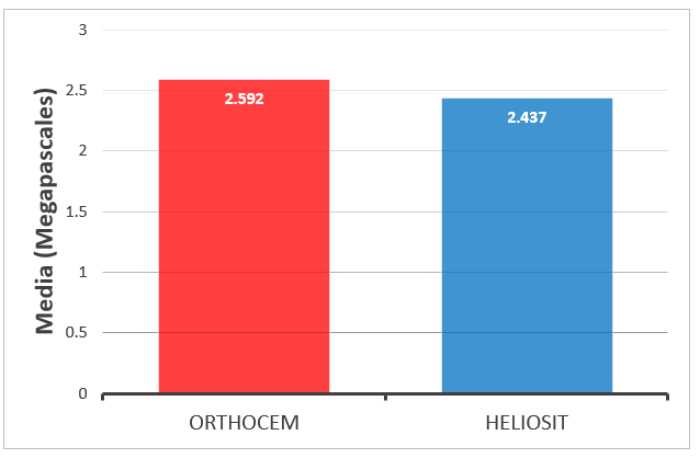 The heliosit adhesive cement presents an adhesive strength of 2437 ± 0,80 megapascals against shear forces.