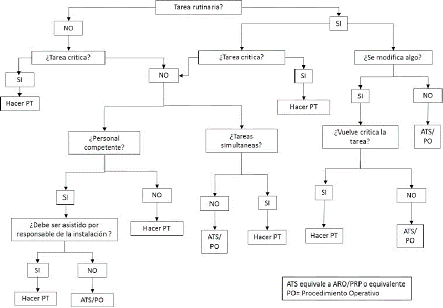 The first step in implementing a permit-to-work system is to identify the jobs, tasks, or operations to which it is applicable. These jobs require the issuance of one or more WPs through a Risk Analysis or a Decision Tree from which each area can draw up its reference list and record it in the Register. It is clarified that these guidelines are neither exhaustive nor limiting and should be taken as a guide to applying for Work Permits.