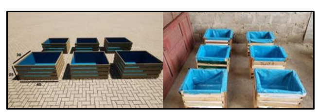 The ponds were designed in 3D using AutoCAD 2017 software, then manufactured with wooden slats measuring 40 cm long x 30 cm wide x 25 cm high. Polyethylene plastic was used for the inner lining, secured with elastic strips to prevent movement, and then placed in the previously prepared space.