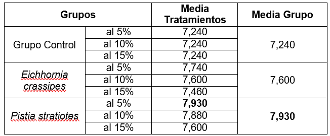 It was determined that there is a significant difference between groups, with the lowest SST concentrations in the Pistia stratiotes group; there was no significant difference in the treatments, however, we can highlight the 5 % treatment.