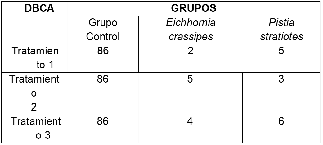 Se determinó el número de plantas que se emplearon en cada tratamiento, considerando los antecedentes y las dimensiones del estanque, ya que lo eficiente se reportaba a partir de 10 plantas; se estimó 5 más y 5 menos para comprobar la funcionabilidad del tratamiento, es decir 5,10 y 15 fueron las cantidades aplicadas para ambos tratamientos.