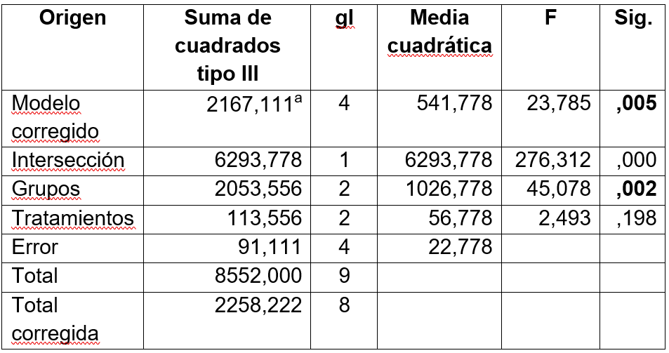 Como el valor de significancia del modelo (0,005) es menor al error (0,05); rechazamos la hipótesis nula, y aceptamos la hipótesis alterna de que si hay diferencia significativa entre los grupos o tratamientos de la investigación; los grupos y tratamientos son heterogéneos, podemos observar para el valor de significancia de los grupos (0,002) el cual nos indica diferencia significativa; y en los tratamientos (0,198), no lo son.