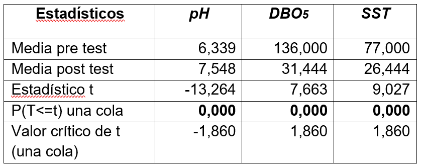 Al realizar el contraste del pre y post test de los parámetros en estudio, podemos observar que existe diferencia significativa en los resultados, debido a que la probabilidad T Student de una cola (0,000) es menor al error (0,05). Al analizar la diferencia de medias del parámetro pH, observamos que el post test es mayor al pre test, y en los parámetros DBO5 como SST es al contrario, obteniendo promedios menores en el post test comparado al pre test que es lo que se espera.